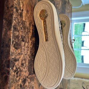 Stylish brown and gold sneakers with logo design. Features lace-up closure and metallic accents. Great shorter laces with metal tips