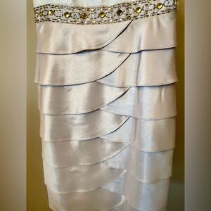 Chic sleeveless dress with a white top and beige layered skirt. Features a decorative neckline. Perfect for graduation or bride!