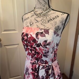 WHBM Pink and purple floral print dress on white background sleeveless a-line retro design. Zipper back and clasp.