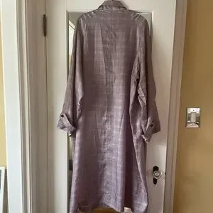 Very lightweight, unlined cupro fabric. Could be worn belted as a dress. Would be so cute thrown over jeans and a t-shirt for weekend errands.