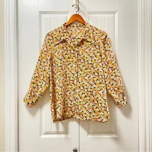 Add a touch of retro charm with this vintage floral long sleeve blouse! With its vibrant yellow, pink, and green floral print, this top evokes groovy '70s-80s vibes. The silky polyester-like feel makes it perfect for layering or wearing on its own for a relaxed, boho look.