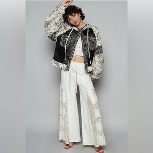 Add a unique touch to your wardrobe with our Balloon Sleeve Floral Contrast Crochet & Gauze Jacket by POL. This jacket features beautiful crochet patches, metal flower snap buttons, and front pockets. The ruffle with raw edge details and vintage washing adds a playful and vintage vibe.