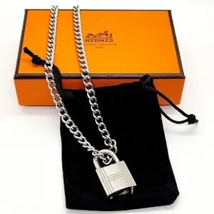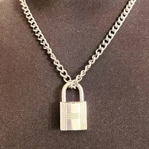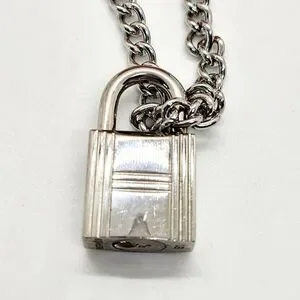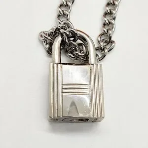 Hermes Cadena Silver Lock #51 On 18-inch chain, no key. Comes with black pouch and Hermes box. Has light scratches. Please see all of the pictures. In very good pre-loved condition.