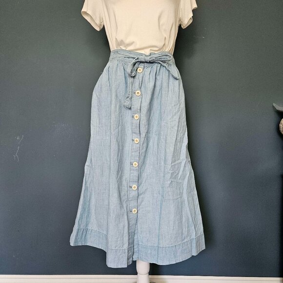 Madewell Light Blue Midi Skirt. 100% cotton and has pockets! The cream buttons are functional. Has a tie in the front. Very cute for spring and summer.