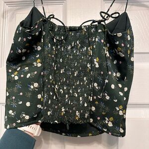 This elegant green camisole top features a delicate floral pattern and tie strap detail with smocking and a zipper. Perfect to dress up or down during the warmer months. In perfect condition. Color is accurate in stock photos.