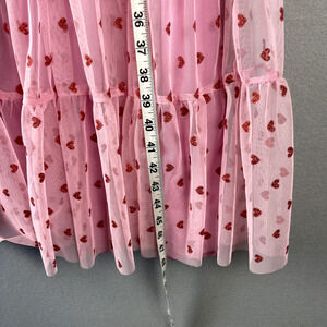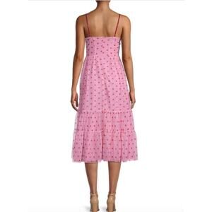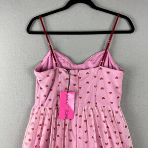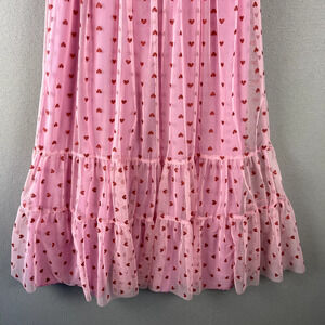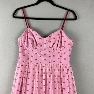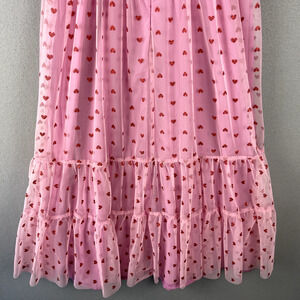 Vintage charming pink midi dress with heart pattern. Features spaghetti straps and a tiered skirt. Perfect for a playful look.