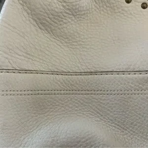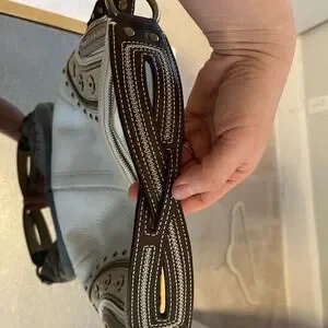 This stylish hobo bag features a chic crescent shape in a sophisticated white and brown color palette. Crafted from high-quality leather, it boasts a textured finish and is adorned with metallic studs for a touch of elegance. The dark brown shoulder strap adds a striking contrast, making it a versatile accessory for any occasion.