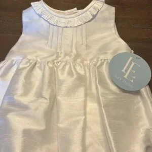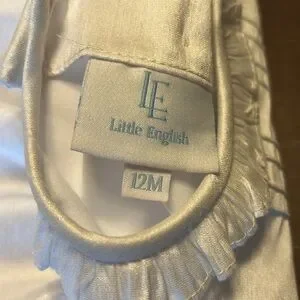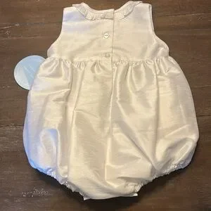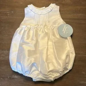 Little English New with Tags White Formal/ Special Occasion Bubble, size 12 months. Fully Lined, Buttons on the Back, Snap Bottom. 16” Top to Bottom, 10” Armpit to Armpit. Would be Beautiful as a Christening/ Baptism Outfit, or for a Wedding, Fabric looks like Silk. Excellent New Condition