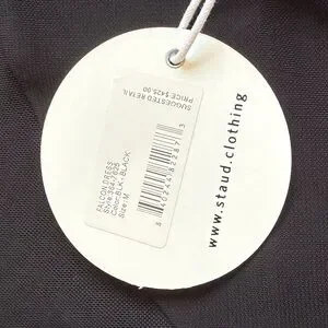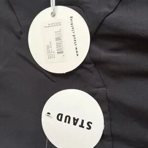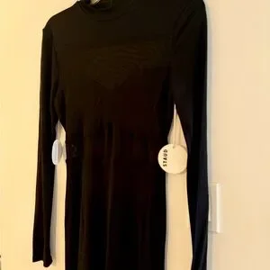 This stunning black gown by STAUD is designed for a night out, featuring a fitted silhouette with strategic cut-out details and a mock neck. The long sleeves and sleek sheath style add a touch of elegance, making it perfect for cocktail occasions.