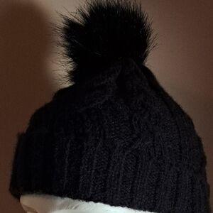 Black beanie hat with a fur looking pom on top. One size. Nice used condition.