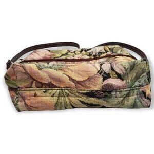 Shoulder bag / Crossbody bag with peach and pink floral tapestry. Brown Strap. Zipper pocket on the front and small zipper pocket inside. Gold tone hardware.