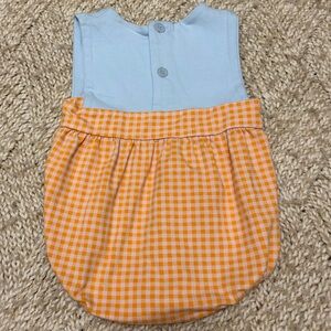 Adorable baby romper with pumpkin design. Features orange gingham pattern and light blue top.