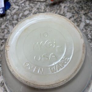 Elegant ceramic mixing bowl with blue and tan stripes. Perfect for kitchen use.