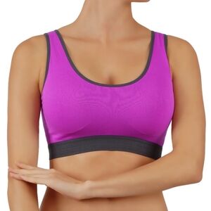 Controlled stretch helps stabilize core while allowing full range of motion. Breathable power-mesh sides stretch for flawless fit. Wide, smooth bottom band add extra support and comfort. Pullover, Style, and Removable Pads. Soft, Stretchy, and Super breathable, built for high medium-Impact. Made with 92% Nylon and 8% Spandex. Machine washable ease care. Small and large available in white and black. Medium available in purple and black.