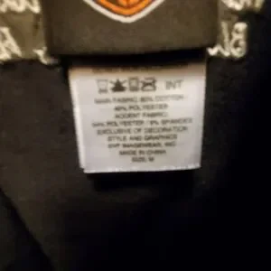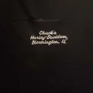 This is a very cute short sleeve women's Harley Davidson size medium black top with white designs. This top is preowned in very good condition only worn a few times. This would make a great top to wear to those Harley rallies In Sturgis Daytona, Laconia... and Milwaukee. The upper portion of the back has a very pretty sheer material as pictured. The The back says Chuck's Harley Davidson Bloomington Illinois