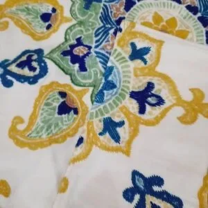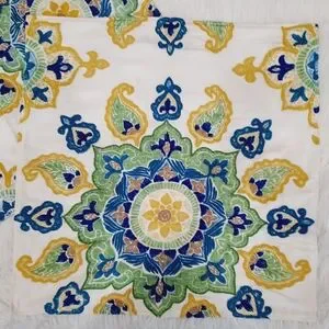 Add a vibrant touch to your home with this colorful embroidered throw pillow. Featuring a stunning design in blue, green, and yellow, it's perfect for any living space.
