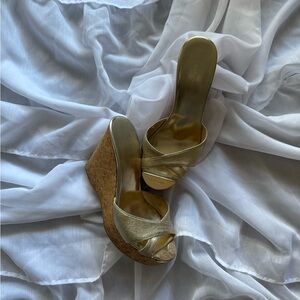 Jimmy Choo Prima wedge cork sandals. Gold patent leather upper with cork ultra high heels and gold toe. Tagged as a 36, equivalent to a 6.