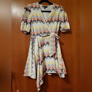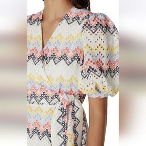 RTR. Like New. Flirty allover eyelets in a trie wrap dress. Puff sleeves and an asymmetrical hem.