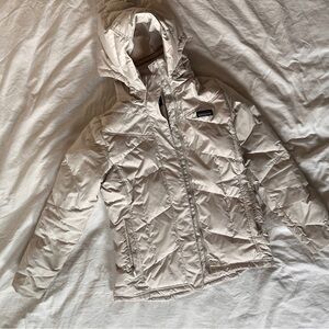 Patagonia down with it jacket, has kept me very warm! Please note the slight discoloration and some marks around the sleeves, and some spots on the jacket. This jacket is in used condition