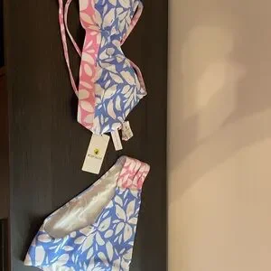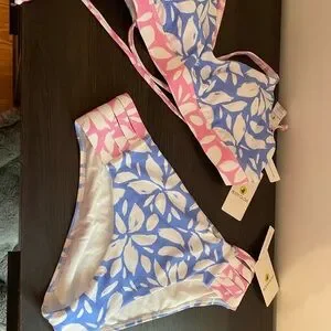 Stylish bikini set with a blue and pink leaf pattern. Perfect for beach days.