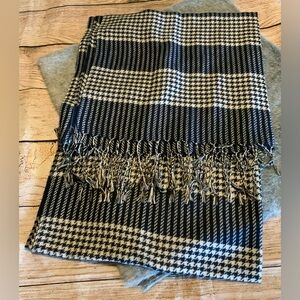 Elegant black & white houndstooth scarf featuring fringe accents. NWT.