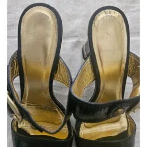 Very good condition, see last 3 pics, smudge on gold heel cap, slight wear on interior heel, normal wear on bottom of shoes