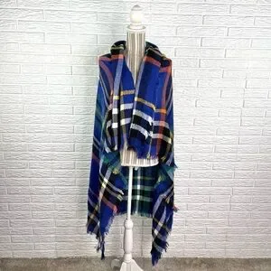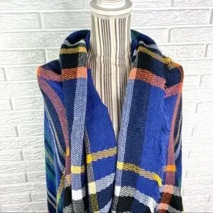 Multicolored Plaid Flannel Shawl Scarf with Fringe Blue Yellow Black Orange White Green