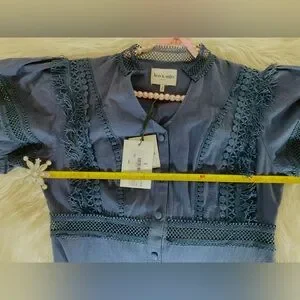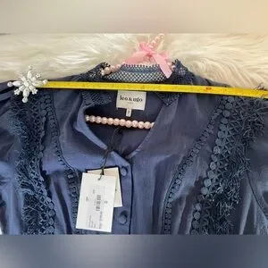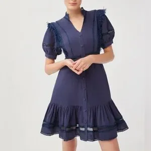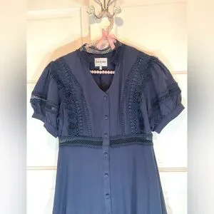 Elegant navy blue dress with lace trim details. Perfect for any occasion.