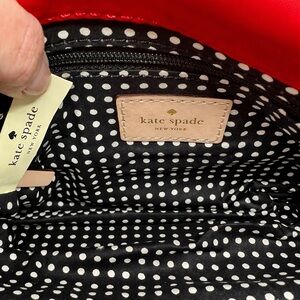 This vibrant cherry red crossbody bag by Kate Spade is a functional and fashionable choice. Crafted from durable nylon with a chic fold-down top design, it features a beige leather strap and signature polka dot interior lining. Includes zip front pocket, zip interior pocket, and adjustable strap for comfortable wear.