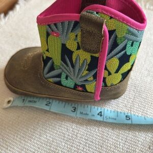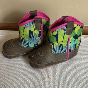 These stylish baby booty boots feature a vibrant cactus print with a touch of pink. Perfect for adding a fun flair to any outfit.