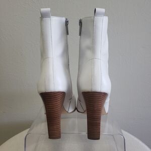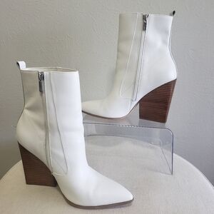 The Kailey bootie from Bleecker & Bond will add confidence to your stride. A pointed toe and extra chunky block heel creates a sleek yet trendy silhouette that will make this ankle boot your new go-to. Leather upper Inside zip closure Pointed toe Fabric lining Lightly padded footbed 4" stacked block heel Synthetic sole Imported in great condition