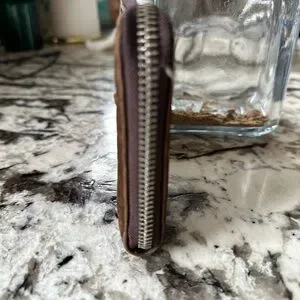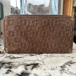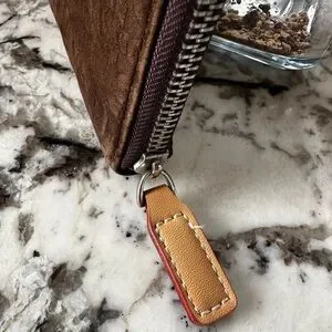 Stylish brown wallet with embossed design. Features a secure zip closure.