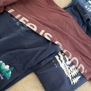 Set of 6 Life is Good Crusher graphic long sleeve t-shirts, size XL. All in excellent condition. Fishing shirt is only one with pic on back (as shown). The navy shirt with the moon in the trees was maybe worn once if at all. Burgundy shirt has LIFE IS GOOD down the sleeve, see pic.