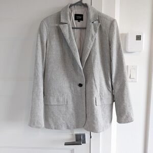 Stylish gray blazer featuring black trim. Perfect for formal or casual wear.