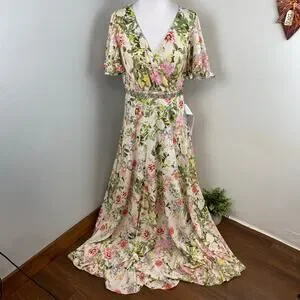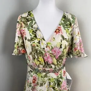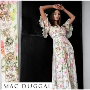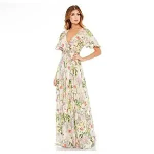 Mac Duggal Floral Print Faux Wrap Flutter Sleeve A Line Gown Floral SIze 12 9079