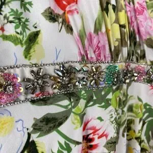 Floral surplice maxi dress with a faux-wrap v-neckline, ruffle-trimmed short bell sleeves, and a pleated full-length skirt. The waist is accented with a floral rhinestone-embellished belt.