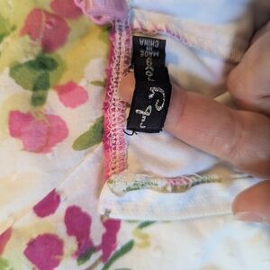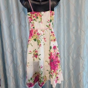 Embrace elegance with this stunning floral dress, featuring vibrant pink and green hues. Perfect for any occasion. lost the original ribbon which matched the shoulder straps and was slightly wider than the replacement ribbon and not translucent.