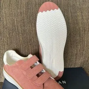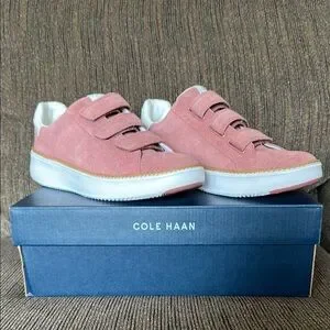These Cole Haan sneakers feature a soft pink suede upper with convenient velcro straps for easy fastening. The white sole provides a stylish contrast, making them perfect for casual outings.