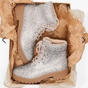 Add some sparkle to your look with a classic combat boot in all-over embellished rhinestones. Style these boots with your favorite party dress or casual jean. An awesome shoe choice for the bride!