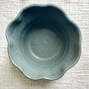 Selling this sweet studio pottery in blue with an added scalloped edge. Love the speckled blue color and rough bottom, with the artist’s signature. This small bowl is so cute and can be used with a candle, for matches, for toothpicks, or nuts, or candies, or flowers, or whatever! Lots of uses!