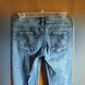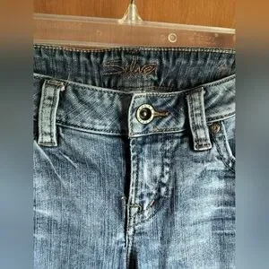 These Silver Jeans showcase a classic blue color with a vintage wash, offering a timeless and worn-in look. Made from high-quality denim, they ensure comfort and durability for everyday wear. The subtle distressing adds character, making them a versatile wardrobe staple.