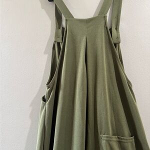 Stylish green suspender dress featuring white buttons. Perfect for casual outings.