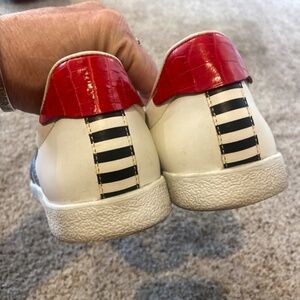 Features: Lace-up closure, leopard tongue, round toe, and a flat rubber sole. Red leather heel with blue strips. Made in Portugal.