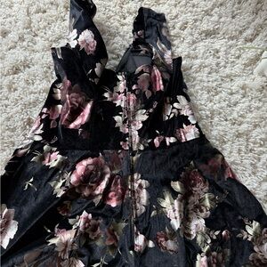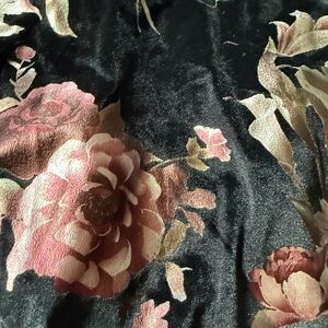 Off-shoulder dress deep v suede elegant flowy dress with a stunning floral pattern. Unique material. Features black and pink tones.