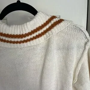 Stay warm and stylish with this cozy white sweater featuring chic brown accents. Perfect for any casual outing. Could be a dark orange 🍊