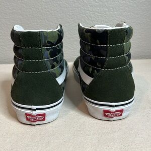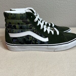 Elevate your sneaker collection with these Vans Sk8-Hi Drippy Camo Green/White high-tops, worn only once and in excellent condition. Featuring a stylish mix of suede and camo-print canvas, these iconic sneakers offer durability, comfort, and timeless Vans heritage. The padded collar provides ankle support, while the reinforced toe caps and signature waffle outsole ensure long-lasting wear and superior grip.