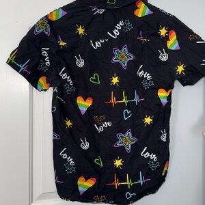 Missing one plain, black button on the bottom. Could easily be replaced. There is even a button inside the pocket. Cute for summer or pride festivities!