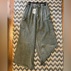 Stylish green wide-leg pants. Features convenient side pockets, it’s a nice gauze fabric perfect for summer. I wish these pants fit, they are so cute!!!