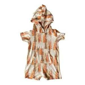 kate quinn Adorable hooded romper with a forest print. Features shades of orange and cream.