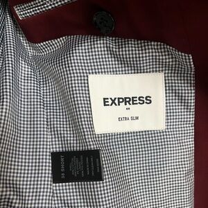 Deep red suit jacket and pants. 2 black buttons on jacket. 4 black buttons on cuffs. Express extra slim fit. Excellent used condition!